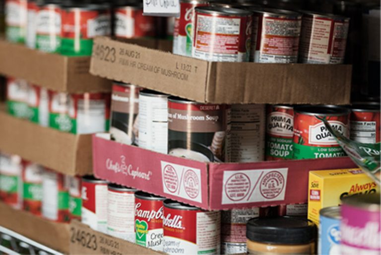 Breakfast & granola bars, peanut butter, instant soups, dry cereals, mac & cheese, canned ravioli, fruit cups, veggies (yams, cranberries, pumpkin, green beans, corn), boxed stuffing, instant potatoes, spaghetti and sauce, Jello, cake or brownie mixes, icing, and laundry soap.